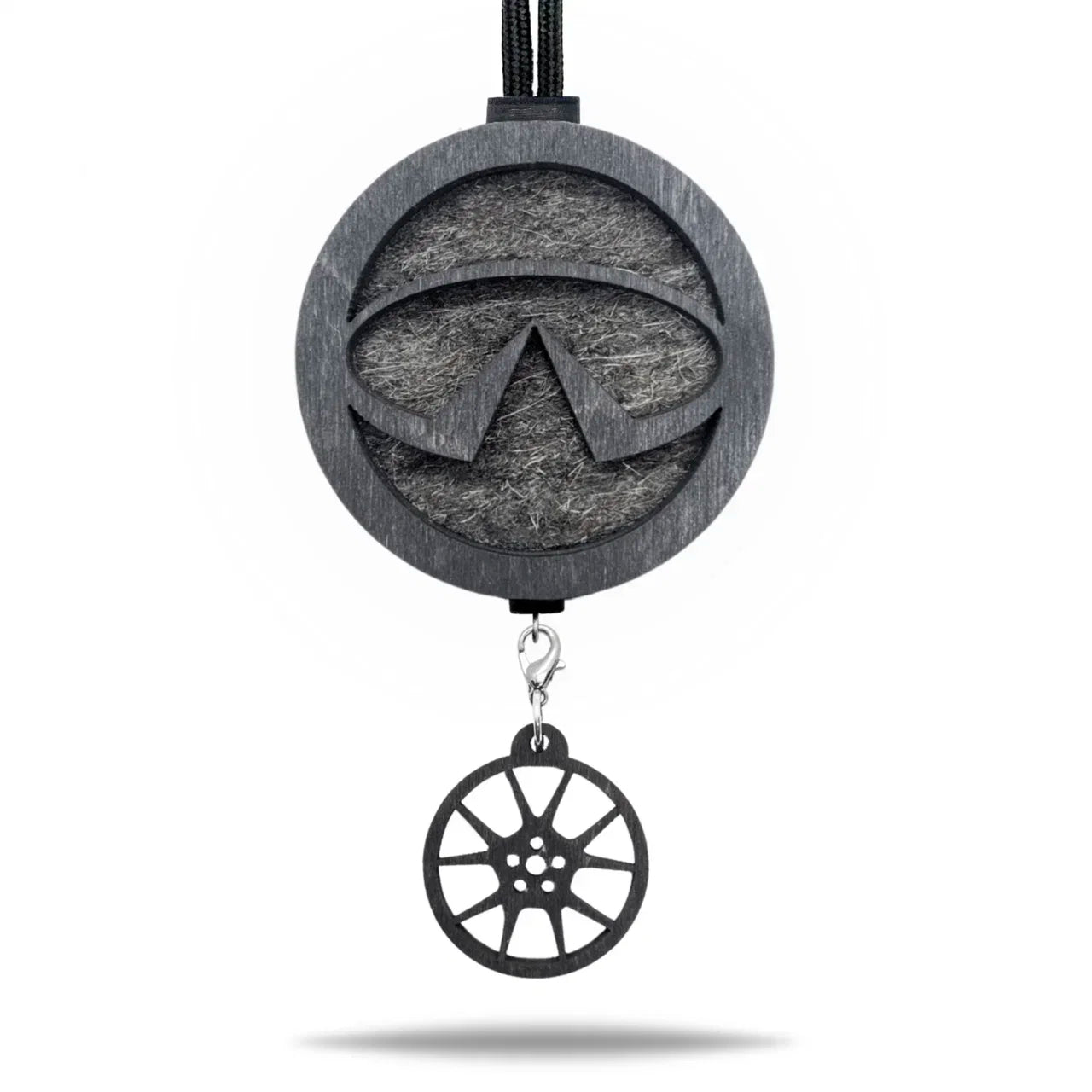 Prémiový prívesok do auta Infiniti v odtieni Čierna je elegantný doplnok, ktorý spríjemní každú jazdu. Vyrobený z prírodnej plsti a dreva, dobre absorbuje vôňu a postupne ju uvoľňuje do interiéru.